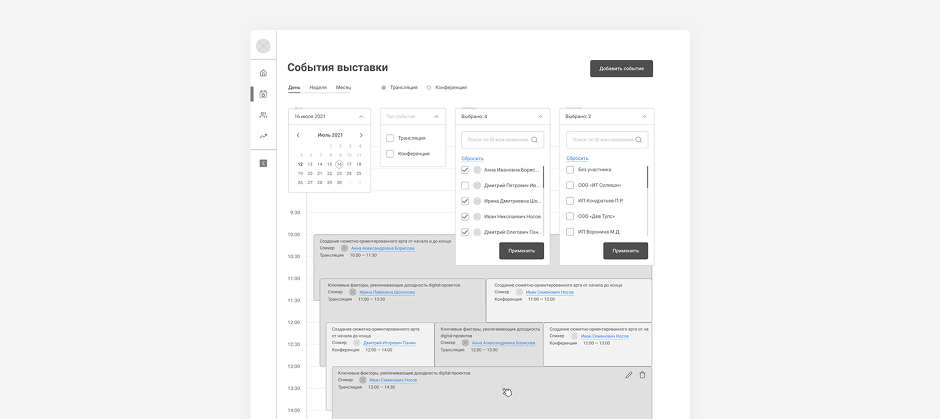 Благодаря фильтрам, можно легко найти нужное событие. События фильтруются по дате, типу, спикерам и участникам