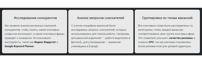 Этот этап был ключевым для оптимизации затрат на рекламу и повышения ее эффективности, поскольку позволял избежать необходимости в общих запросах и гарантировал более точный таргетинг. Для каждой вакансии мы проводим аудит ключевых слов с целью максимально точного таргетинга. На этом этапе мы используем несколько стратегий и инструментов:
