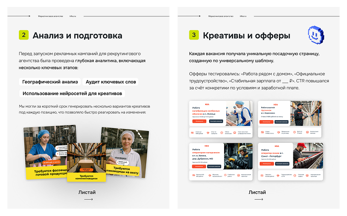После первых недель отключали неэффективные ключевые слова и перераспределяли бюджеты между регионами. Пример: по вакансиям водителей штабеллеров CPL снижен с 1500 ? до 900 ? за счет тестов креативов и уточнения гео. По массовым вакансиям (упаковщики, сборщики) CPL стабилизировался около 300 ?.