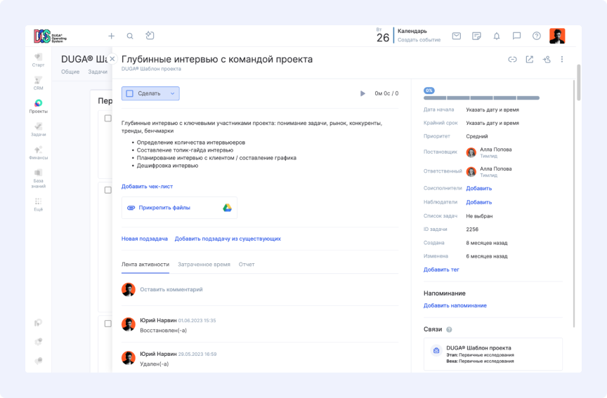 Ранее отделы продаж и проектного управления в DUGA® функционировали изолированно. Часто возникали ситуации, когда менеджер проекта не имел информации о договоренностях, достигнутых на этапе продажи.