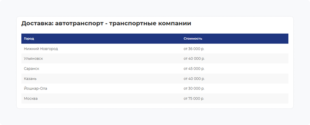 Географическое расширение рынка сбыта потребовало включения информации о логистике. В карточках продукции разместили таблицы стоимости транспортировки до крупных региональных центров, что помогает клиентам планировать бюджет закупок.