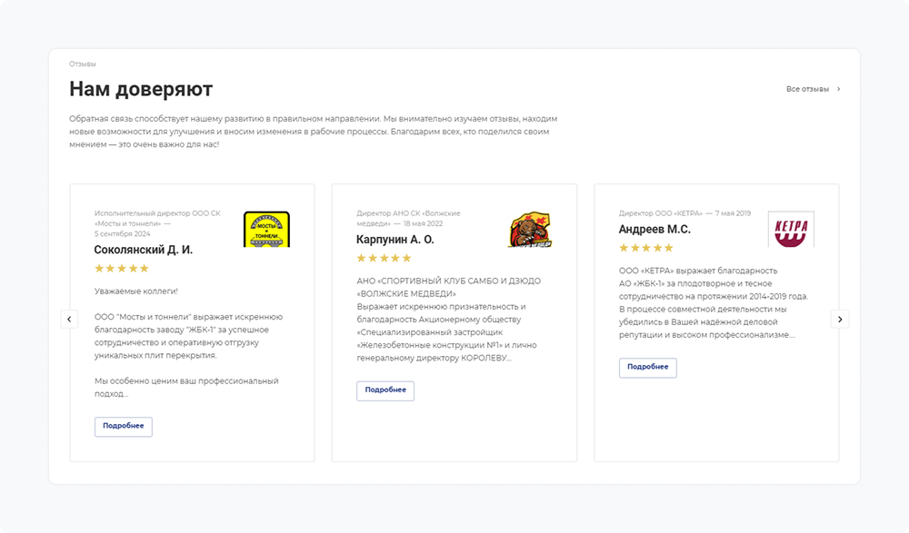 Блок отзывов на главной странице стал мощным инструментом работы с репутацией. Логотипы компаний-партнеров создают положительное первое впечатление, а детальные отзывы с приложенными благодарственными письмами подтверждают качество сотрудничества.