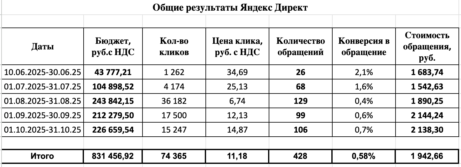 Даже в периоды сезонного падения (сентябрь–октябрь) удалось сохранить объём заявок и удержать стоимость в рентабельной зоне.