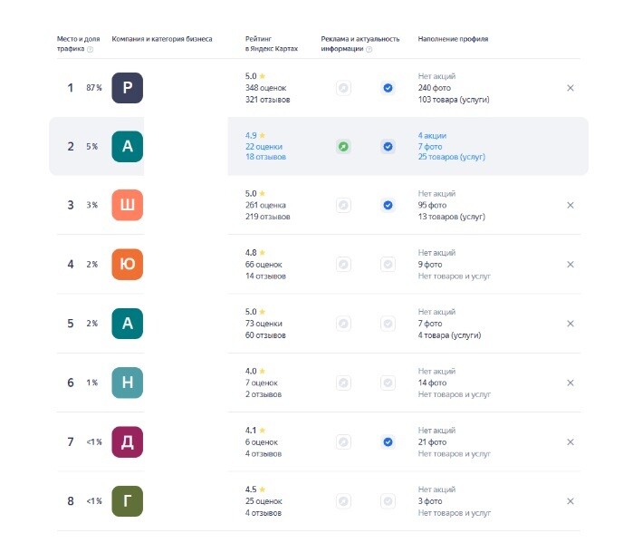 Компания держалась на 6 месте в списке конкурентов в картах. Первый в списке адвокат собирал 85% дискавери-переходов. Карточка нашего клиента — только 1–2%. Этого было недостаточно.