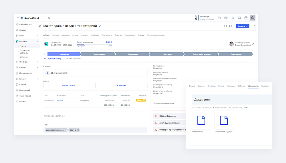 Централизация документооборота решила проблему поиска технической документации. Договоры и технические задания теперь прикрепляются к карточкам проектов, что исключает путаницу между черновыми и финальными версиями документов.