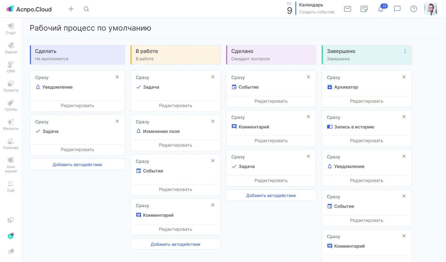 Такая организация позволяет руководству контролировать загрузку команды и отслеживать движение задач по этапам. Для сложных проектов команда настраивает индивидуальные этапы и сохраняет их как шаблоны для повторного использования.
