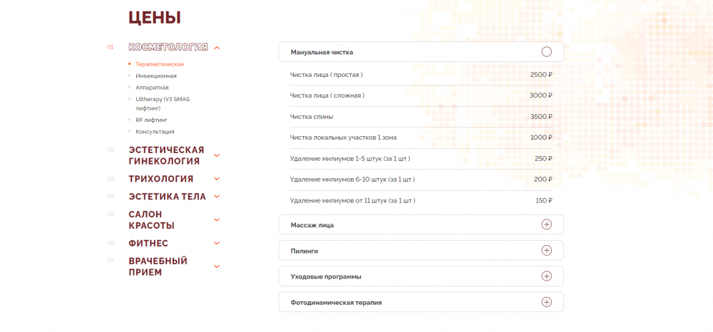 В «Золотой линии» очень много услуг, поэтому в прайсе мы сделали навигацию по общим направлениям и декомпозировали их по подгруппам. Чтобы узнать цены, пользователю достаточно найти нужный вид процедуры и развернуть список.