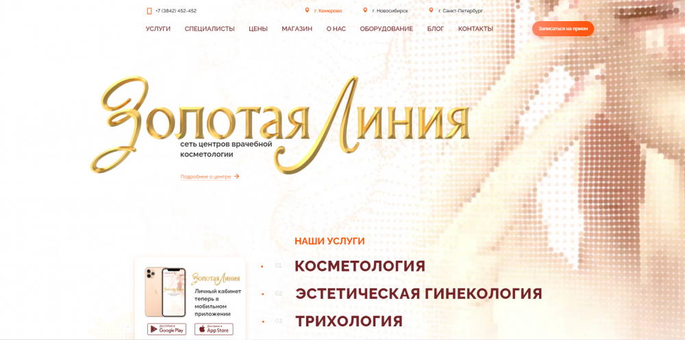 «Золотая линия» — это косметологический центр с филиалами в Санкт-Петербурге, Новосибирске и Кемерове. В них представлено огромное количество услуг по разным направлениям: косметология, салон красоты, фитнес-центр, эстетика тела, врачебный прием.