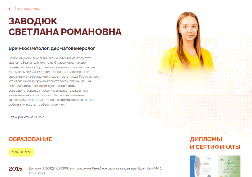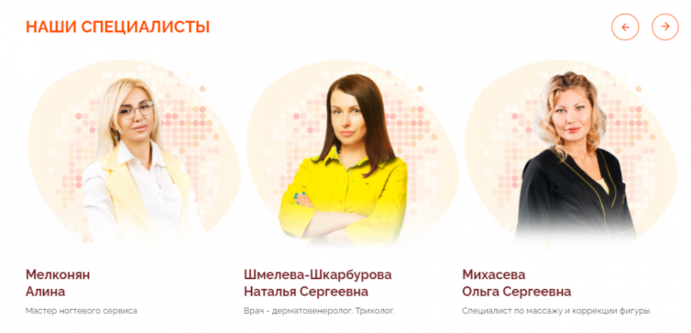 О специалистахОтдельное внимание на сайте уделили мастерам, врачам и тренерам. Пользователям важно знать, что в свои руки они отдают свое здоровье, лицо и тело. Если речь идет о косметологии, клиенты могут подумать так: если у специалиста гладкая идеальная кожа, то он сможет сделать то же самое и со мной.
