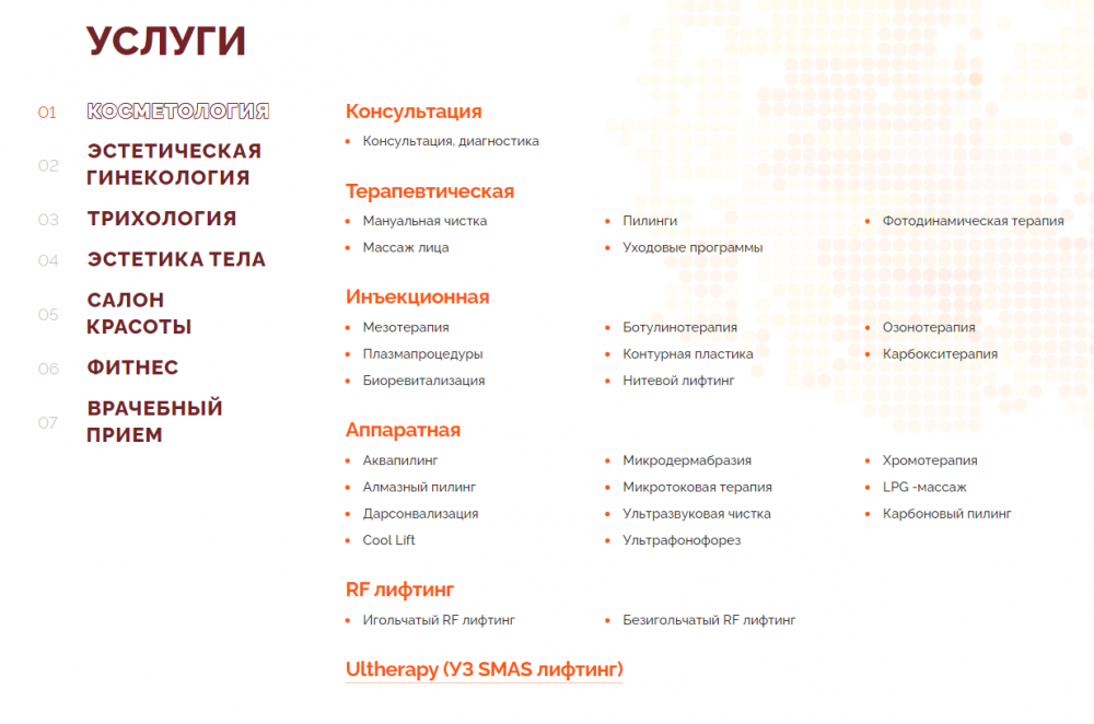 Частая ошибка здесь — Размещение таблицы или текста со всеми услугами подряда. Лучше использовать разбивку по видам и группам процедур, при этом разворачивание меняется списками.