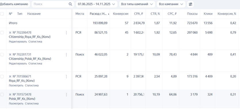 Мы продолжаем тестировать. К 17 июля вернулись 50 000 рублей. Целевых заявок не было. Пришлось остановить все кампании и переосмыслить подход.