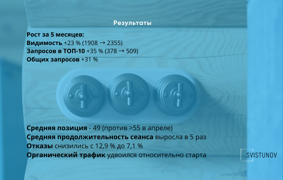 Сайт вышел в ТОП по целевым коммерческим запросам. Региональное присутствие выросло с 0 до 6 регионов: Санкт-Петербург, Краснодар, Екатеринбург, Нижний Новгород, Новосибирск, Казань.