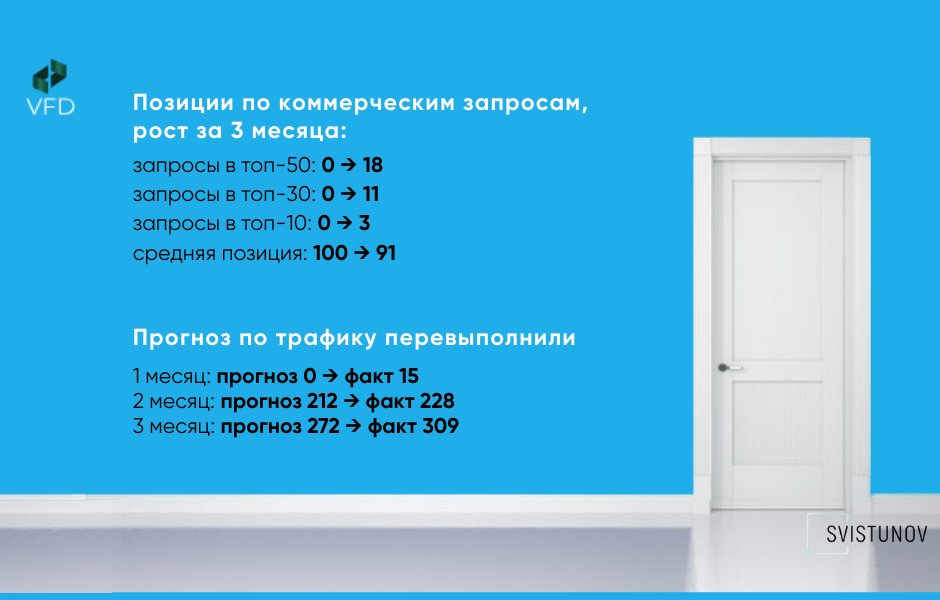 В июне 2024 к нам обратился официальный дилер Владимирской фабрики дверей в Санкт-Петербурге. Компания только начинала работу в городе и запустила новый сайт. Внешне всё выглядело прилично, но с точки зрения SEO сайт был абсолютно пустым: без структуры, без оптимизации, без элементов доверия.