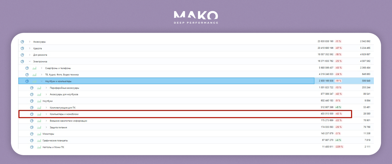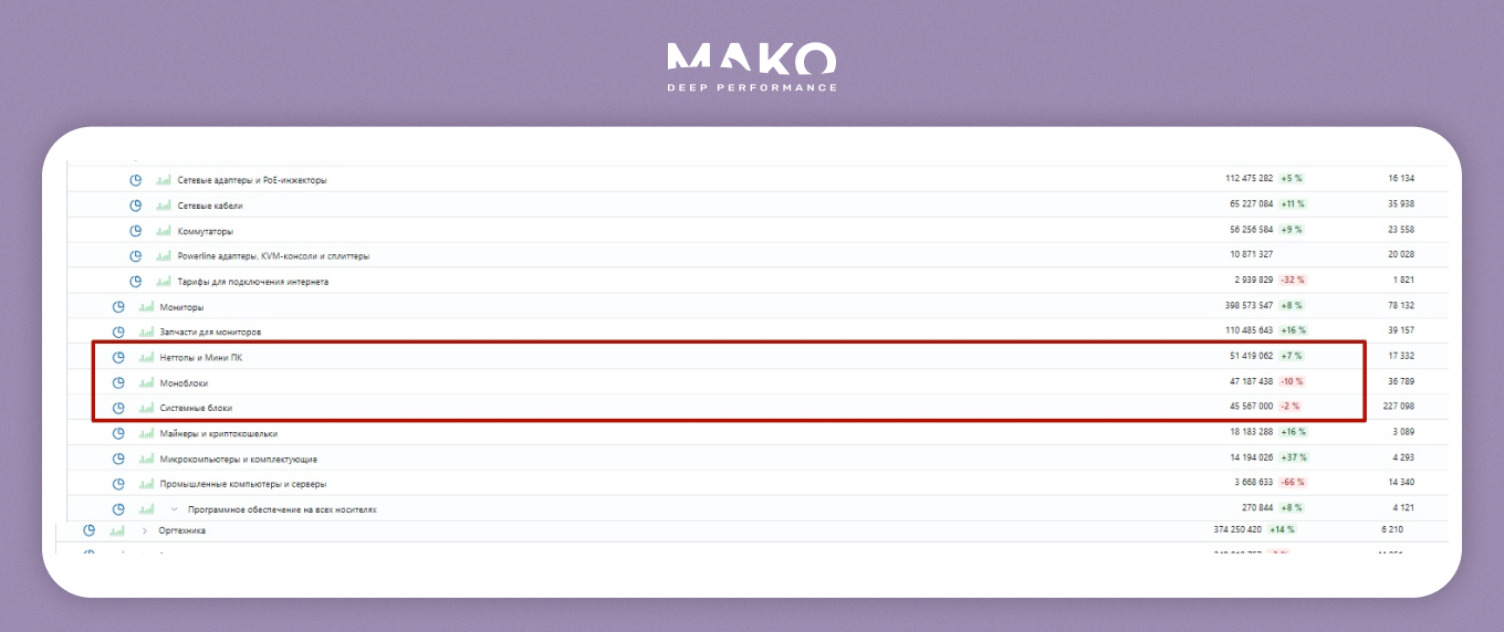 Здесь ждали: сюрприз товаров группы А не обозначени продуктовыми приоритетами селлера. В первую очередь нужно было продавать ноутбуки и системные блоки для ПК, а также допом к ним ? периферийные устройства: кабели, оперативную память, видеокарты, блоки питания. На вкладке именно периферия продавалась активнее всего. Хитом продаж оказался кабель питания за 260 рублей! Низкомаржинальные товары приводят только к ущербу, масштабировать их продажу точно не стоит.