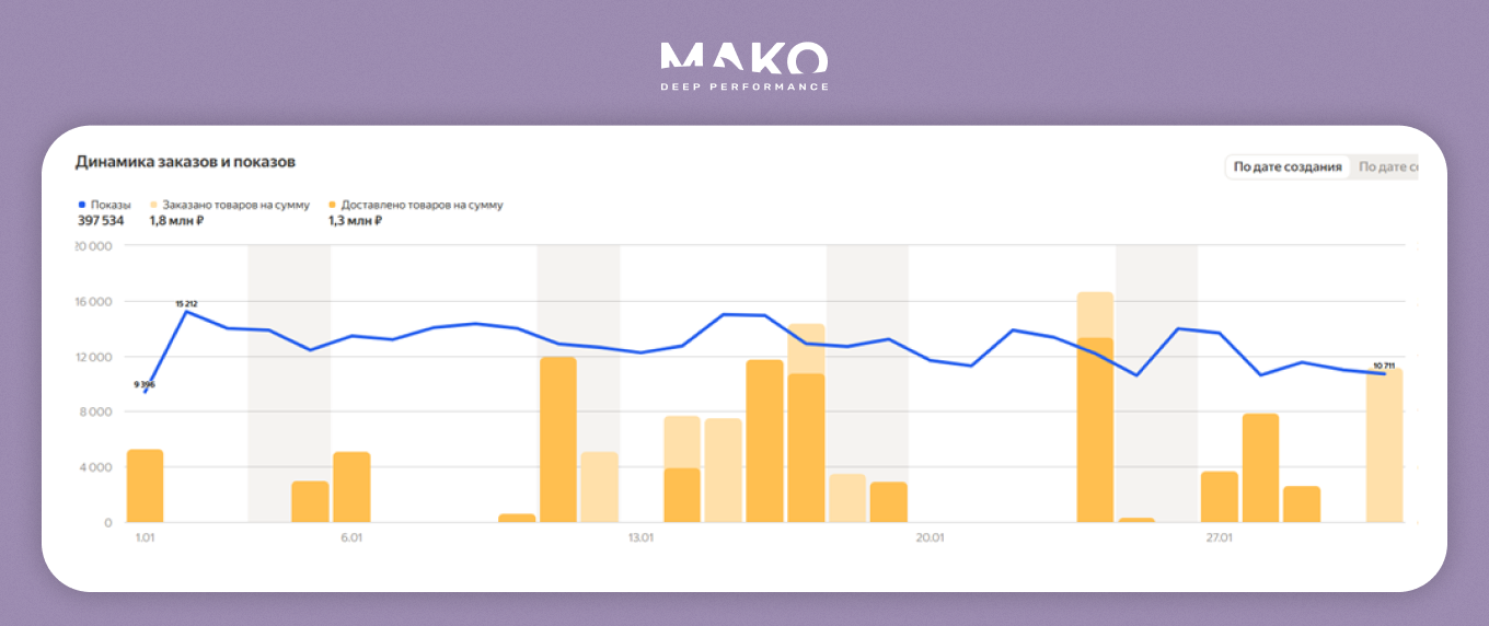 Но в 2025 году как вырезало. В январе число заказов значительно сократилось и не вернулось к прежней позиции в первом квартале. Продавец пытался раскачать продажу, но не смог.