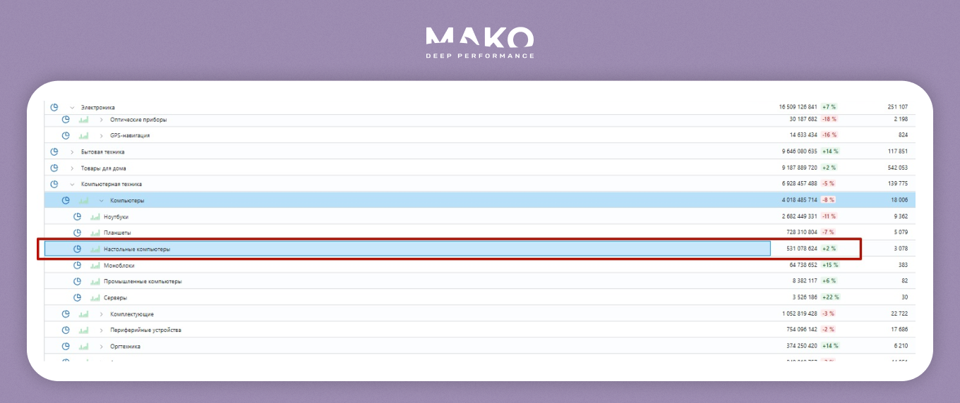 Статистика по продажам в категории настольных ПК на трех маркетплейсах: