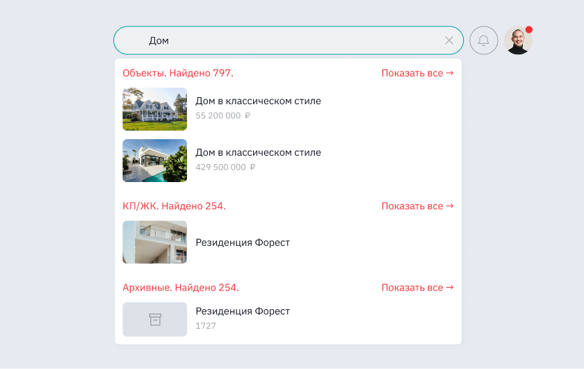 В текстовом списке список объектов выглядит одинаково. Чтобы брокер не тратил время на чтение названий ЖК и адресов, мы добавили визуализацию прямо в саджест (выпадающий список) поиска. В строке сразу отображаются основные фото объекта, цена и статус. Это позволяет находить нужный лот визуально, еще в процессе ввода запроса.