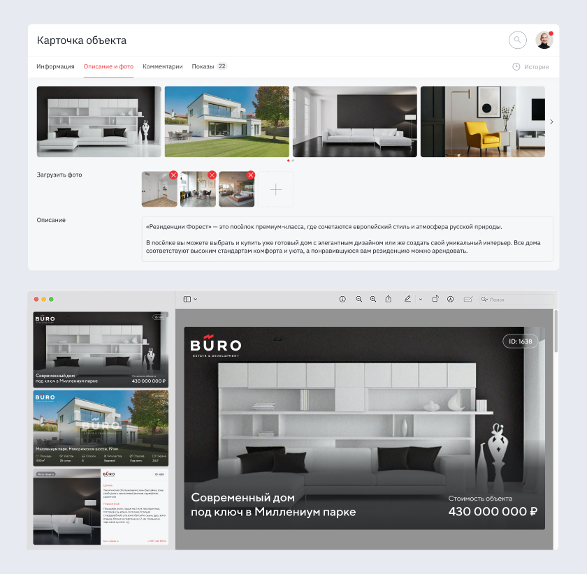 Продажа элитной недвижимости — это сервис. Если клиент просит презентацию квартиры, он хочет получить ее сейчас, а не «когда я доеду до офиса». Но в реальности сборка одной идеи заняла у брокеров Buro Estate много времени: нужно было найти фото на диске, скопировать описание, сверстать.