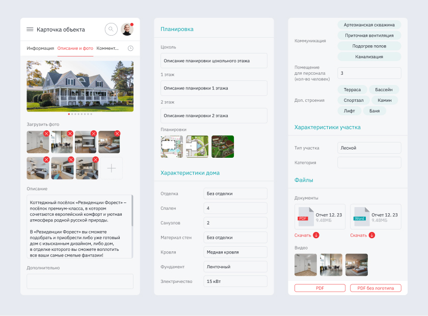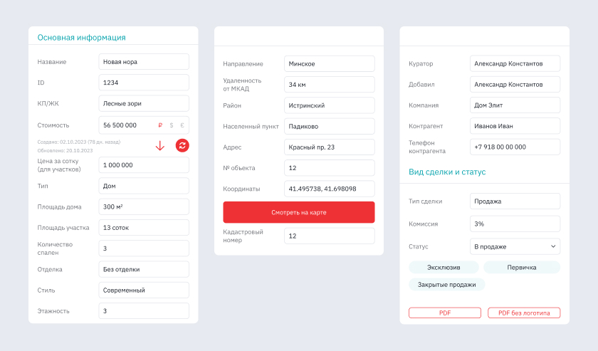 Это главная функция системы. Мы создали из цепочек «брокер — клиент» звено дизайнера. Вместо ручного копирования данных сотрудник просто нажимает кнопку «Скачать PDF». Система сама собирает фото, планы и описания в верстку.