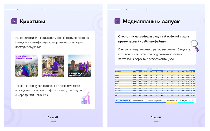 Стратегию мы собрали в единый рабочий пакет: презентация + «рабочие файлы». Внутри — медиапланы по ВК и Telegram с распределением бюджета, готовые посты и тексты под сегменты, схема запуска ВК?таргета с геосегментацией и примерами креативов, медиаплан по Яндекс Директу, отдельный медиаплан по таргету и варианты лид?форм.