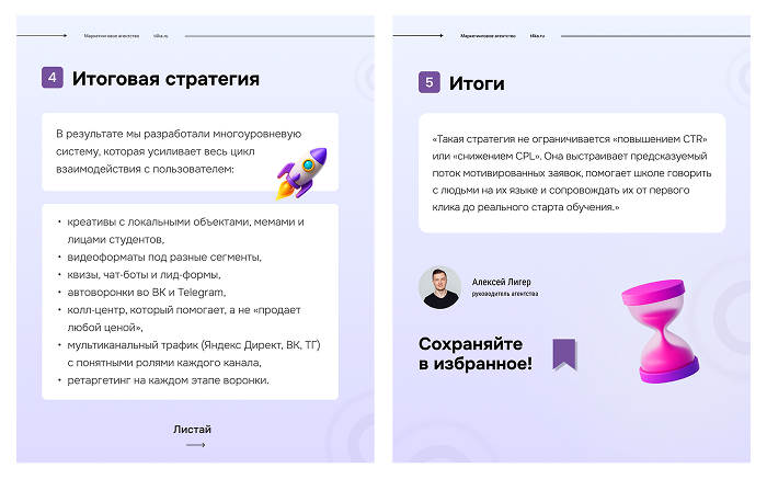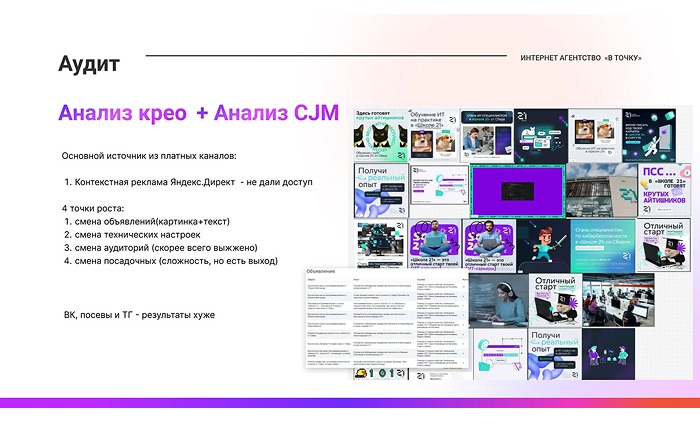 «Такая стратегия не ограничивается «повышением CTR» или «снижением CPL». Она выстраивает предсказуемый поток мотивированных заявок, помогает школе говорить с людьми на их языке и сопровождать их от первого клика до реального старта обучения. И именно поэтому мы считаем: это не просто рекламная кампания, а система роста, которую можно масштабировать и на другие IT? и образовательные проекты.»