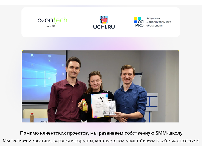 За последние годы мы работали с крупными образовательными проектами: участвовали в развитии IT-направления Ozon Tech, запускали Route256, продвигали продукты uchi.ru и привлекали студентов для EdPro. Такой опыт дал нам глубокое понимание какие инструменты действительно приводят учеников.