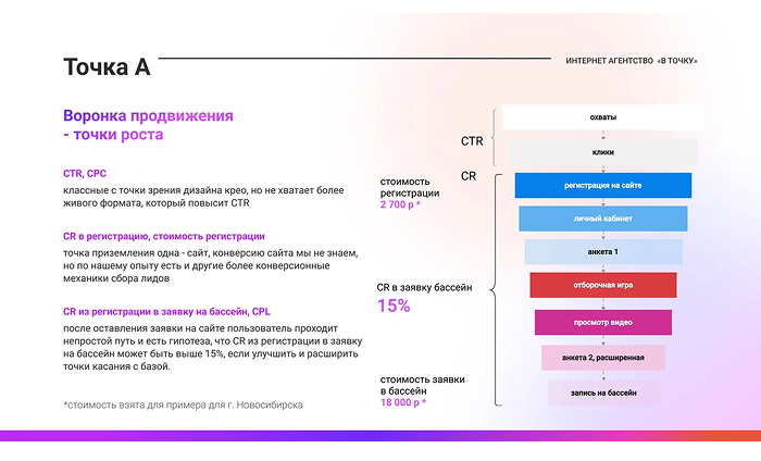 Мы сформировали целевую точку B — стратегию, в которой мы не просто поднимаем CTR и меняем баннеры, а усиливаем каждый шаг: от показа объявления до прихода на отборочный тур. Так у нас появилось три крупных блока роста: повышение CTR, рост конверсии в регистрацию и рост конверсии из регистрации в запись на обучение.