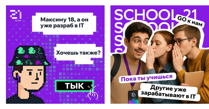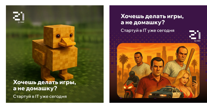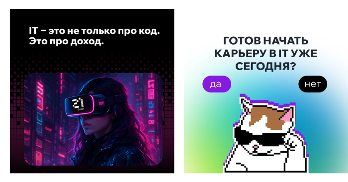 Для школьников и части студентов мы использовали связки с Minecraft, GTA, пиксель?артом, котиками, легким самоироничным юмором: «Хочешь делать игры, а не домашку?», «IT — это не только про код, это про доход». Такие креативы вызывали отклик и позволяли говорить с аудиторией на её языке.