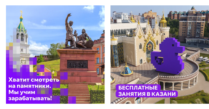 Мы предложили использовать реальные виды городов, кампусы и даже фасады университетов, в которых проходит обучение. На знакомые здания аккуратно «вшивали» фирменные элементы: пиксельную уточку, логотип школы, легкую пикселизацию памятников и площадей. По нашему опыту, такие геопривязанные креативы стабильно поднимают CTR на 25–30%, и здесь мы опирались как на проекты для других клиентов, так и на наш SMM?опыт.