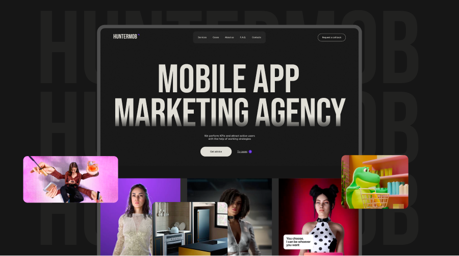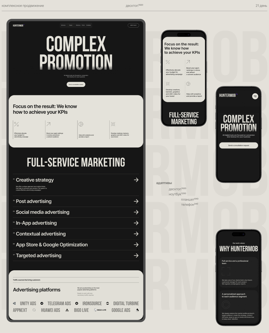 Всё закрутилось в 2024 году, когда к нам пришла Дарья с запросом создать сайт для HunterMob. Это настоящие охотники за пользователями — агентство мобильного performance-маркетинга, с упором на привлечение новых пользователей для мобильных приложений.