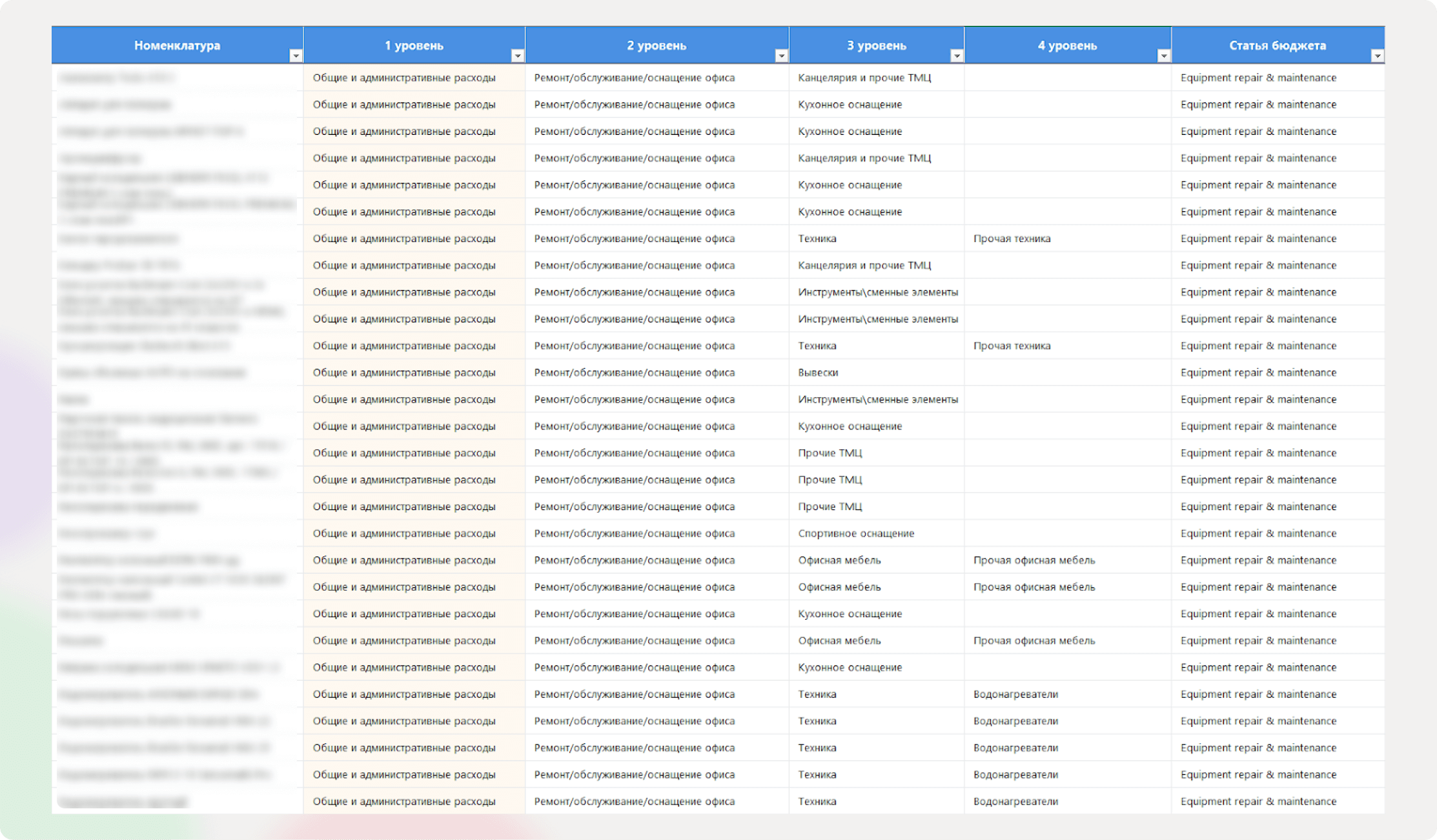 Параллельно с каждым отделом компании мы определили, какие категории закупок у них есть, например: