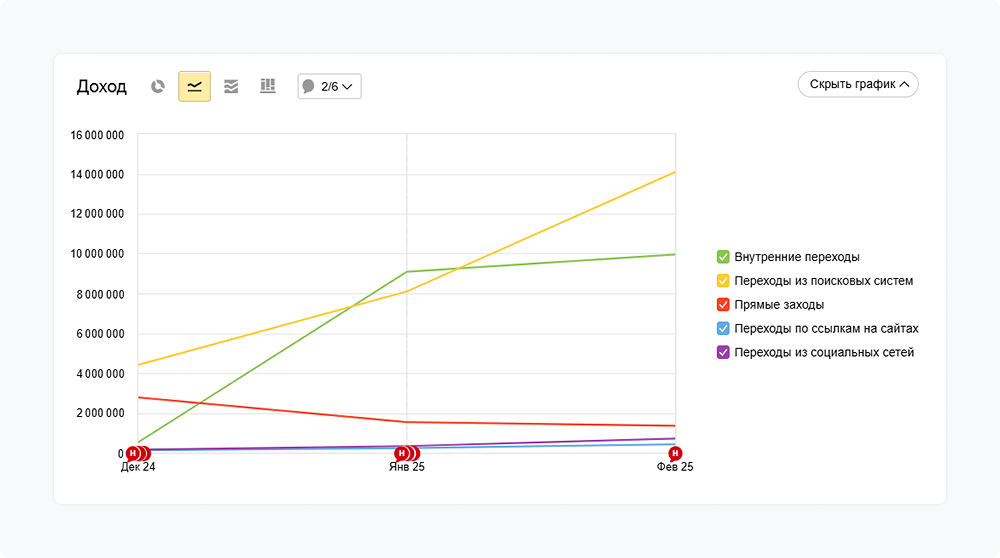 Согласно данным аналитики, поступления от поискового трафика демонстрировали устойчивый рост на протяжении двух месяцев — с 4 млн до пикового значения в 14 млн рублей.