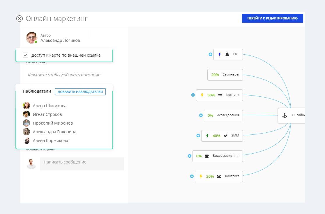 Ментальные карты в Аспро.Cloud применяются для визуализации организационной структуры компании — распределения обязанностей, бюджетов подразделений и архитектуры CMS-модулей.