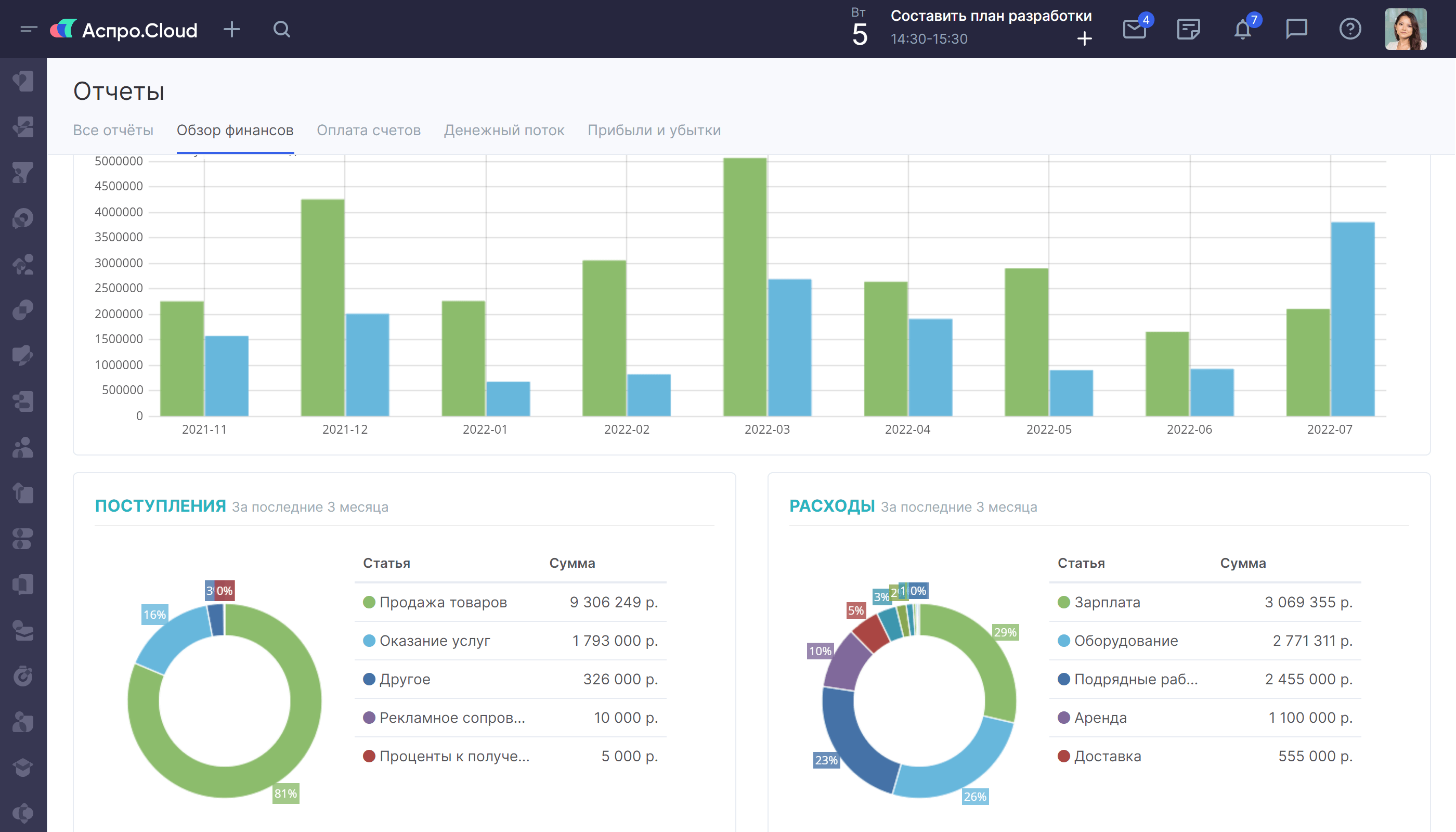 Финансовые процессы полностью интегрированы в Аспро.Cloud. Настроена автоматическая синхронизация с банком — все транзакции поступают в систему без ручного ввода.