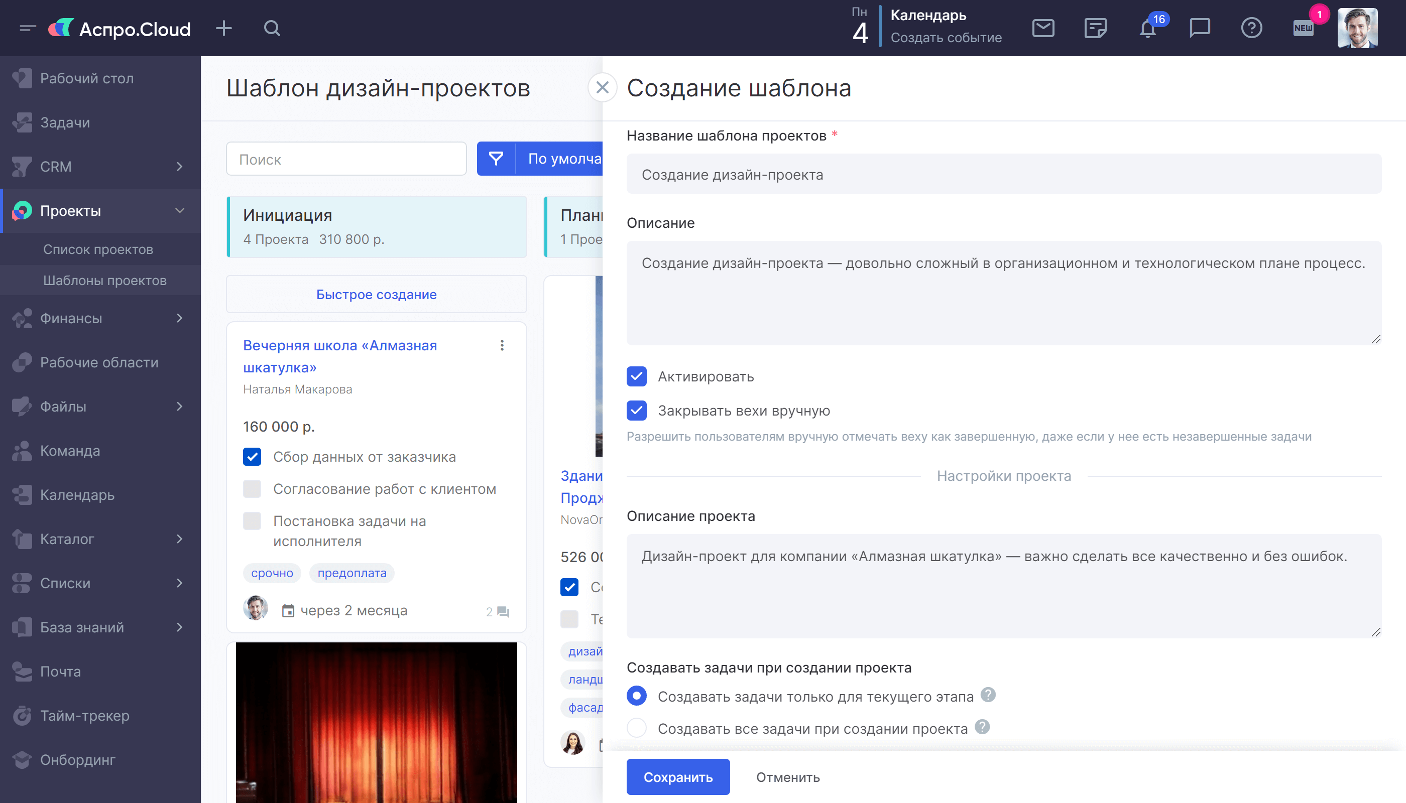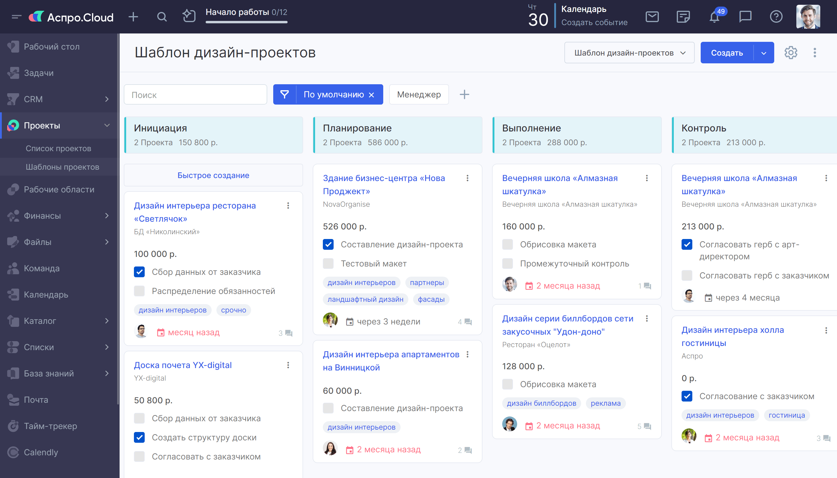 Полный цикл создания интернет-магазина структурирован с помощью шаблонов проектов в Аспро.Cloud. Система включает последовательность этапов, контрольные точки и детализированные задачи.