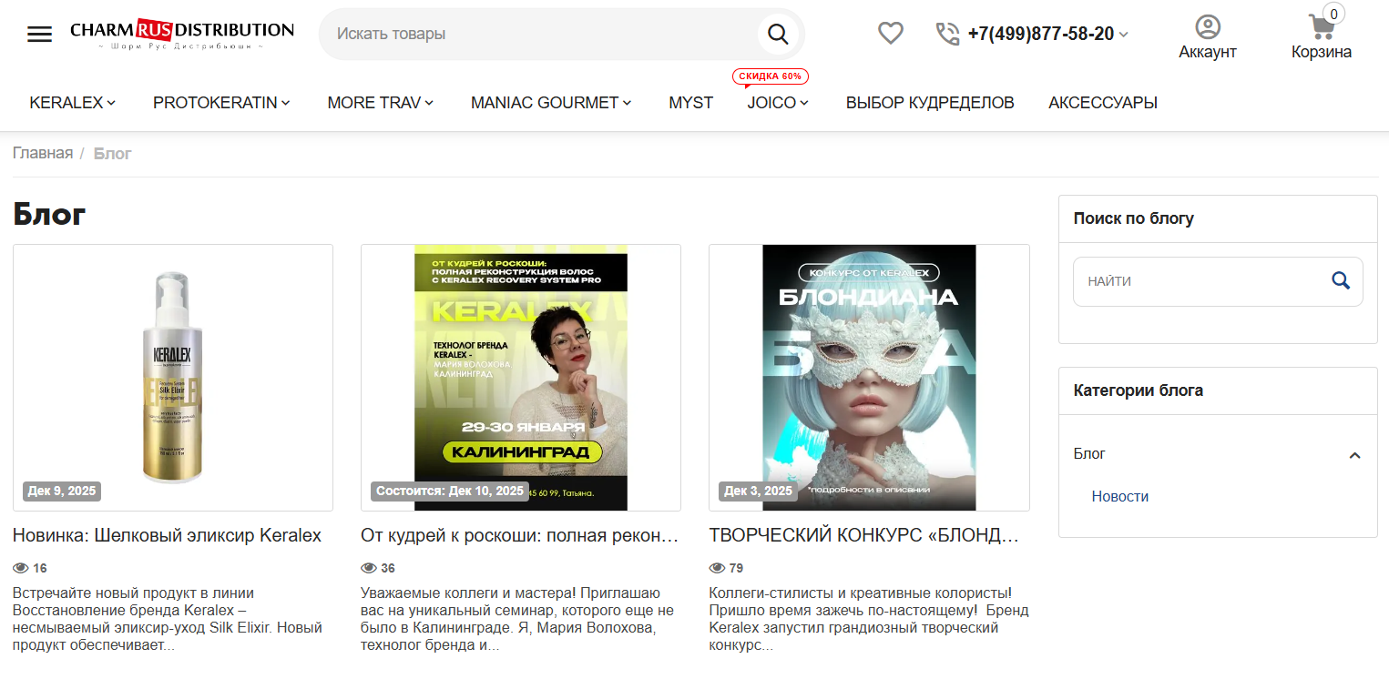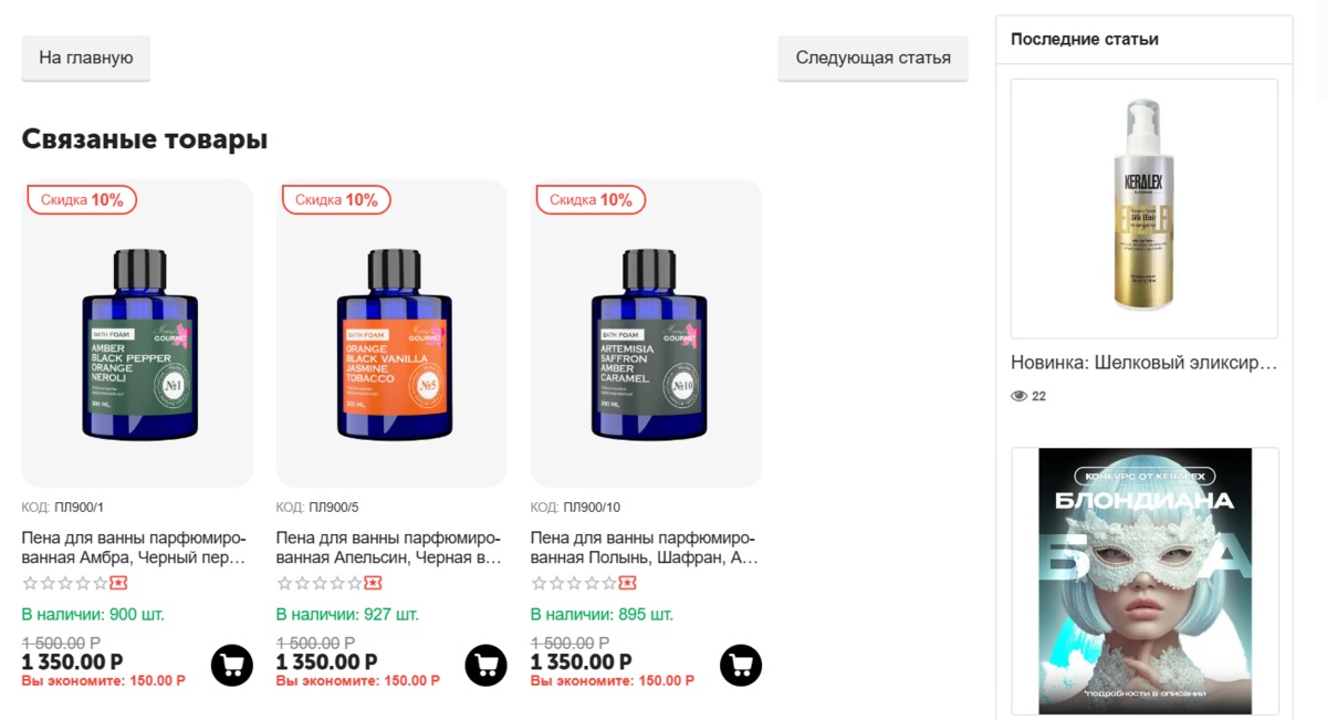 Статьи в блоге содержат ссылки на релевантные товары, что способствует перекрестным продажам и улучшает внутреннюю перелинковку.