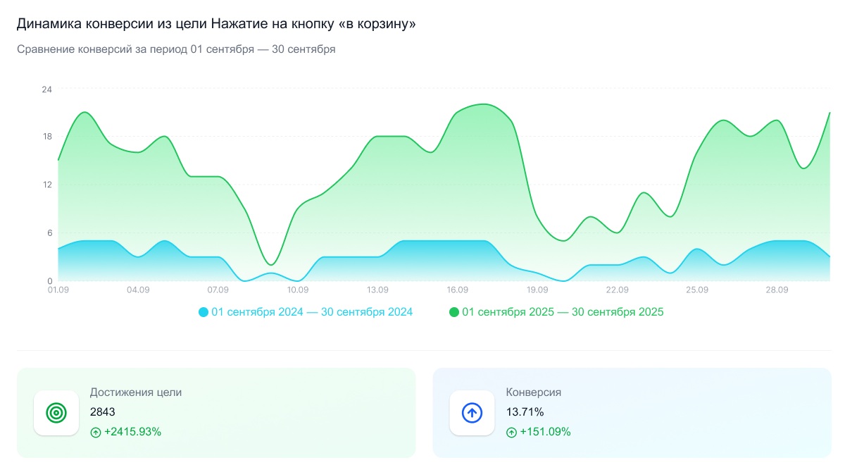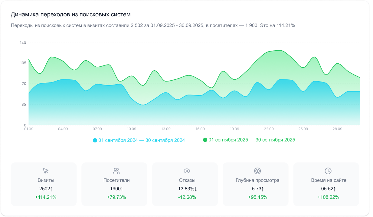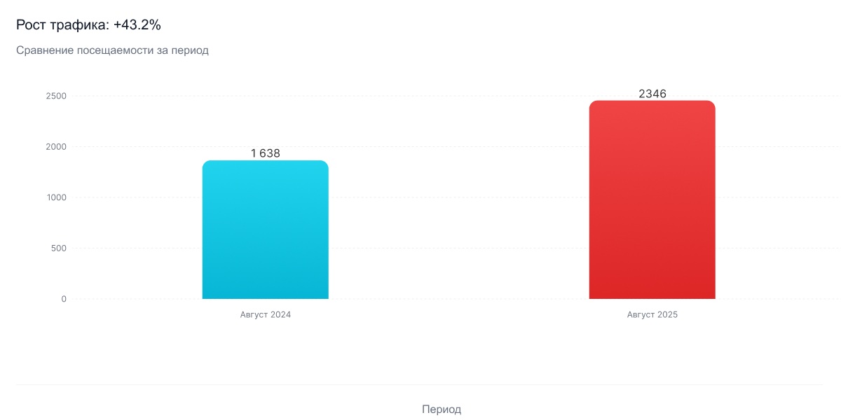Вывод: Темпы роста резко возросли по сравнению с июльским приростом (+2,5%), что свидетельствует о выходе эффективности SEO-мероприятий на новую высоту.