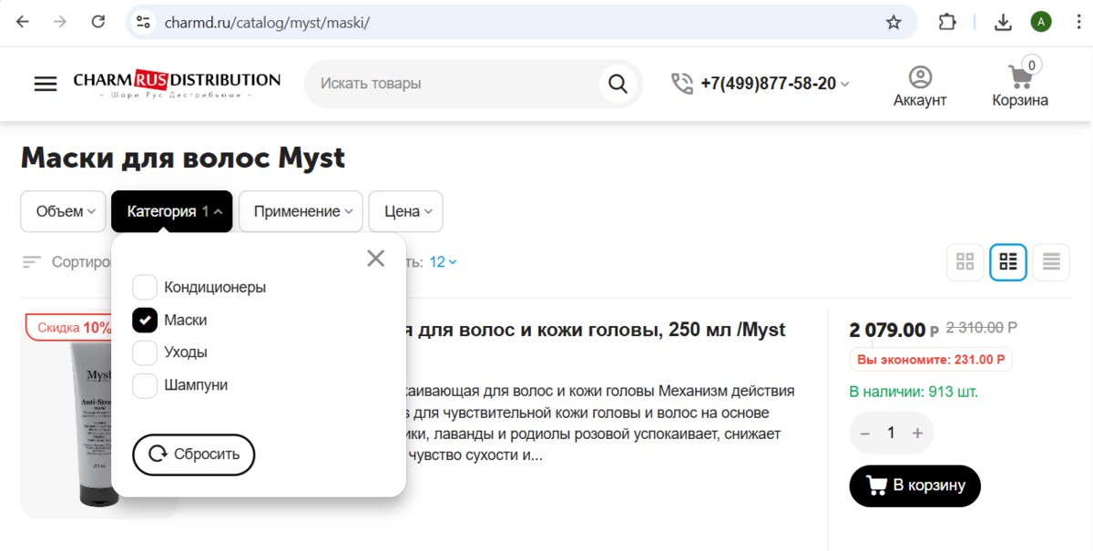 С помощью модуля SEO для фильтров сформировали посадочные страницы по низкочастотным запросам. Например, при выборе фильтра на странице каталога https://charmd.ru/catalog/myst/, идет переход на посадочную страницу со своим URL https://charmd.ru/catalog/myst/maski/, заголовком и мета-тегами.