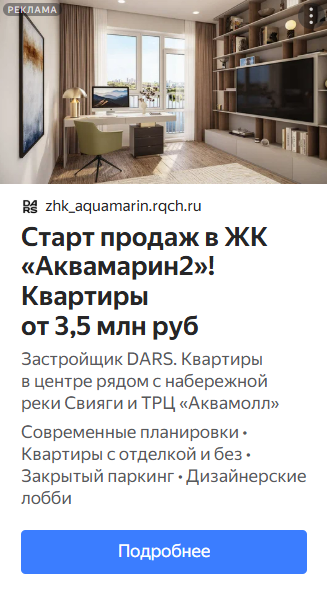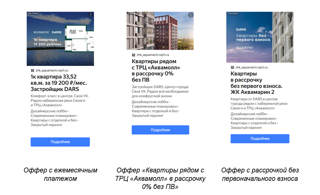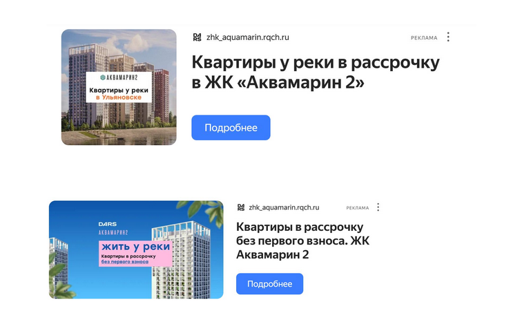 Мы запускали текстово-графические объявления с рендерами ЖК, планировками и разными офферами, например, с ежемесячным платежом, с минимальной стоимостью квартир и др.