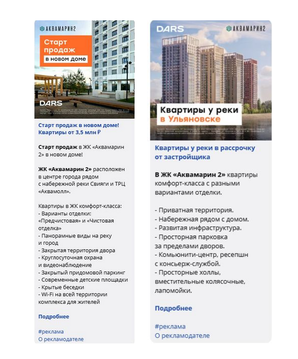 Во многих креативах мы использовали ключевое УТП проекта — «Квартиры у реки» и «Жить у реки».
