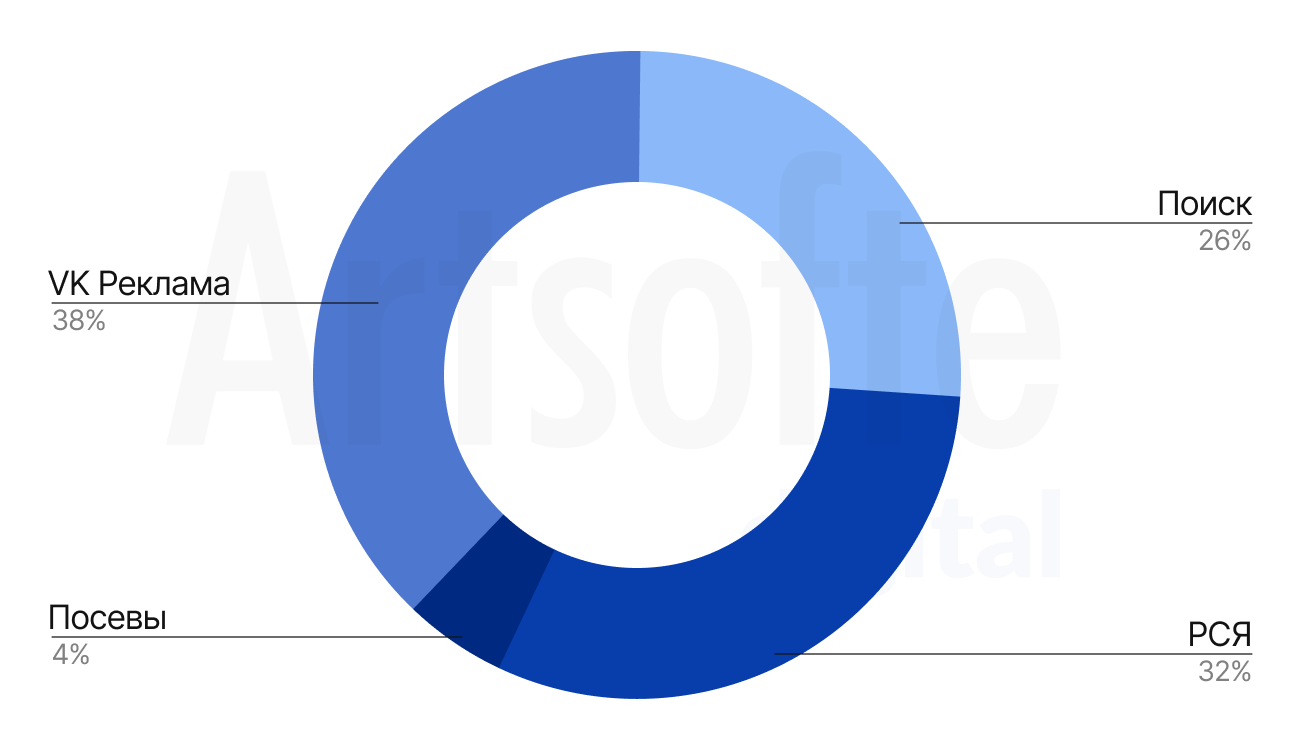 Поиск, РСЯ и ВКонтакте стали основными каналами лидогенерации. При этом 69% всех целевых лидов было получено из ВКонтакте и РСЯ — каналов, которые традиционно считаются источниками более холодного трафика.