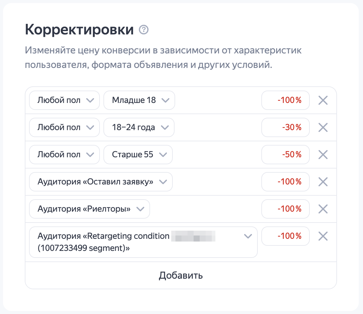 Корректировка аудитории в Яндекс Директе. Нижняя строчка — минусация ботной аудитории, которую собрал BotFAQtor
