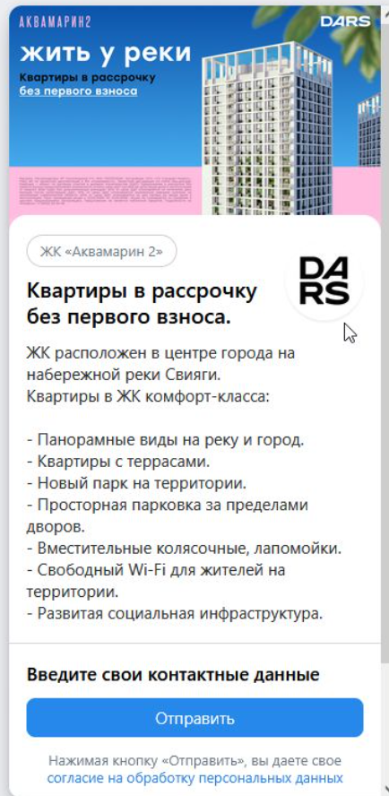 Сотрудничество нашего отраслевого digital-агентства для недвижимости Artsofte Digital с DARS началось в 2017 году с продвижения первой очереди ЖК «Аквамарин» в Ульяновске. Мы работали над повышением узнаваемости жилого комплекса и увеличением количества обращений в отдел продаж застройщика.