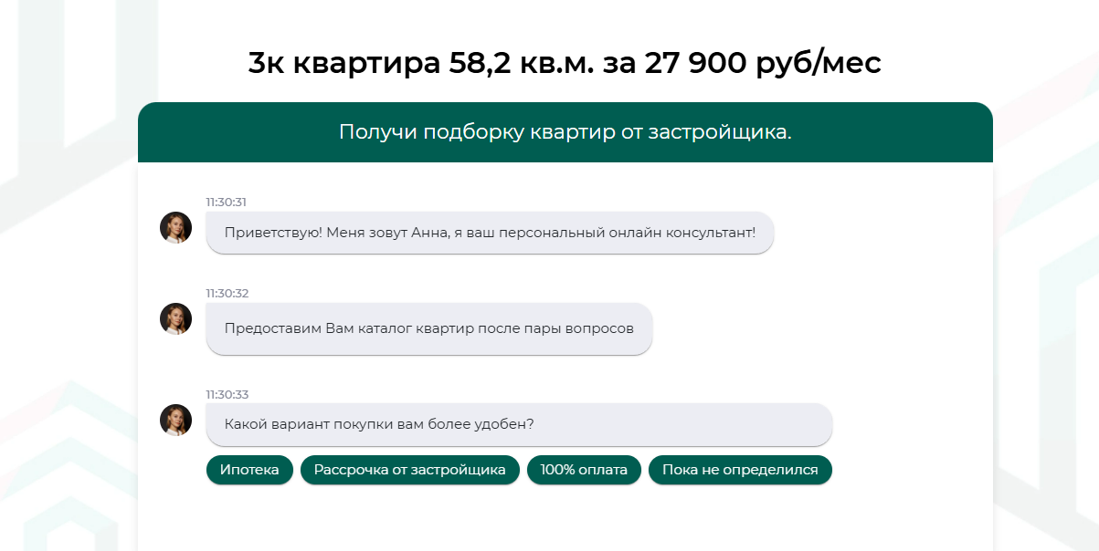 Чат-лендинг — сайт с чатом, на котором консультант задает вопросы, пользователь отвечает на них и получает бонус — фиксированную скидку, каталог квартир и т.д.