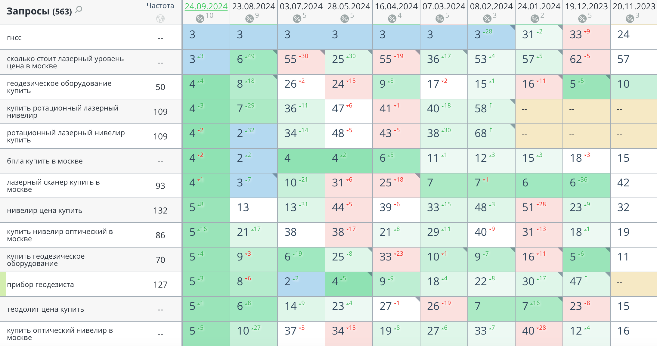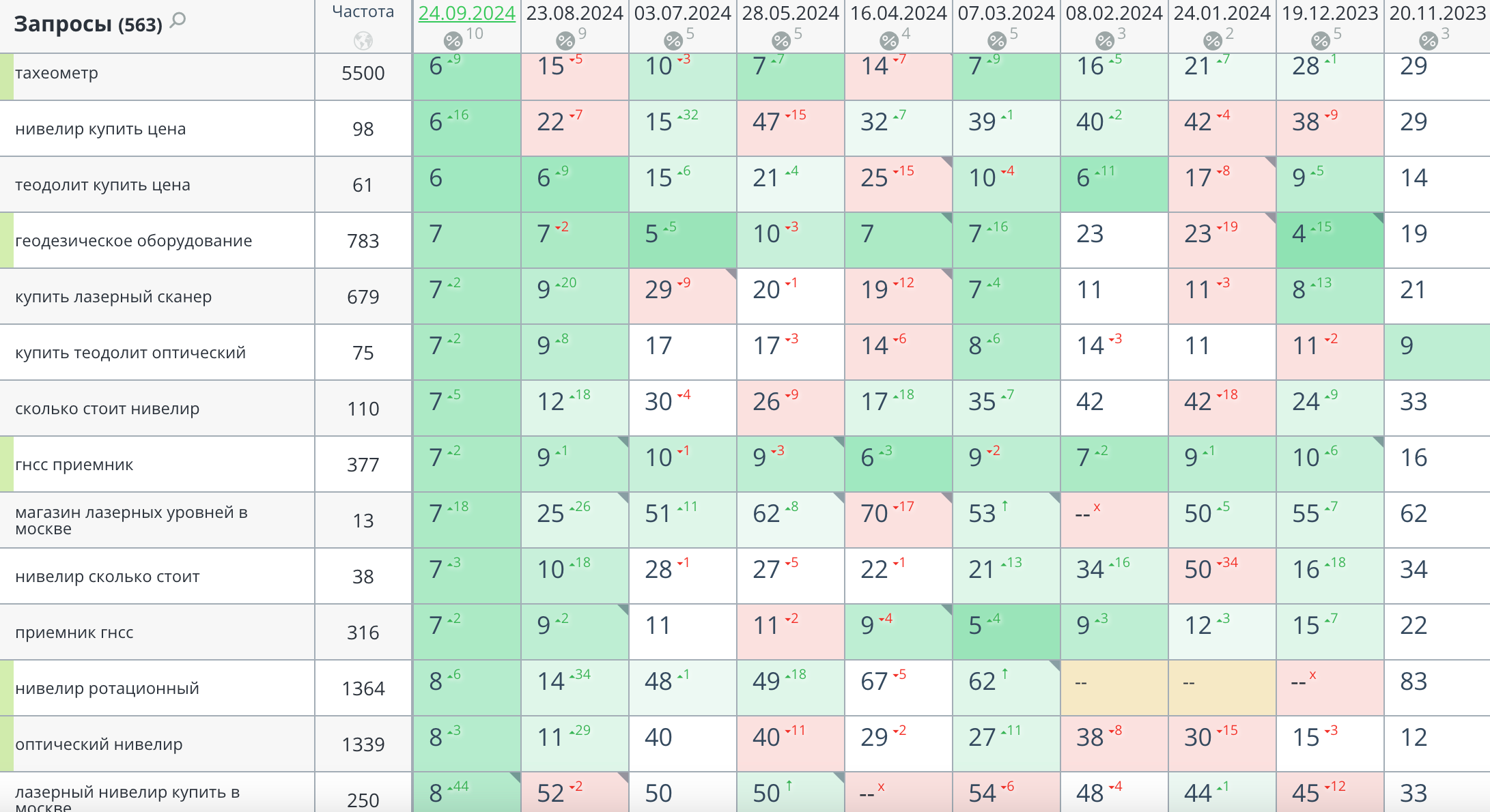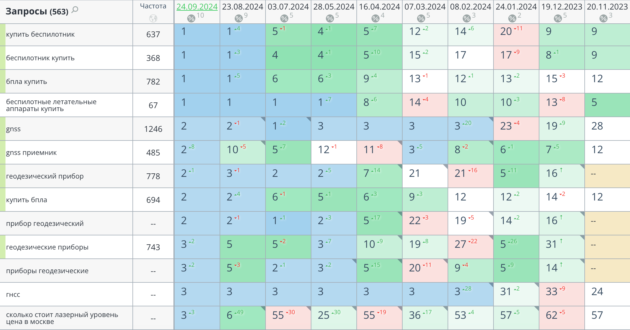 Кластеризация запросов была необходима, чтобы распределить их по разным страницам сайта. Мы сгруппировали ключевые слова в тематические блоки, что позволило каждой странице быть максимально релевантной своим запросам. Например, все запросы, касающиеся конкретных моделей геодезического оборудования, были сгруппированы и распределены на страницы товаров, в то время как более общие запросы, касающиеся использования и особенностей, были направлены на информационные страницы и статьи блога.