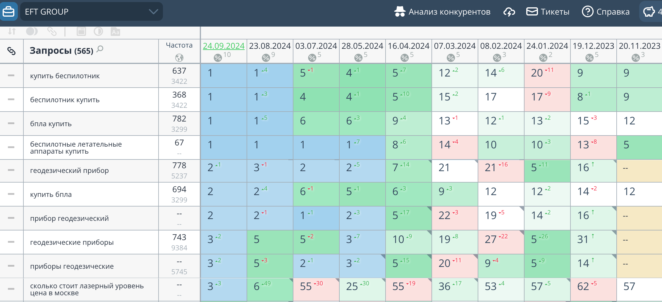Сначала мы собрали обширный пул запросов, используя профессиональные инструменты для анализа поисковых тенденций и ключевых слов, таких как Ahrefs, Semrush и Яндекс.Вордстат. Это позволило нам выявить все потенциальные варианты запросов, по которым пользователи могли бы найти продукты и услуги "ЕФТ-Групп".