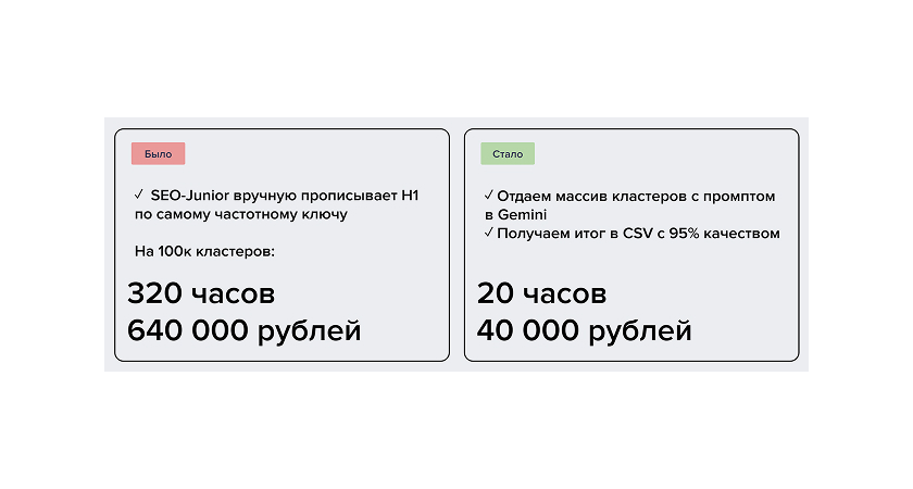 Когда всё это переложили на нейросети, процесс резко ускорился. Необходимость в найме 12 специалистов отпала — хватило 6 человек, работающих с AI.
