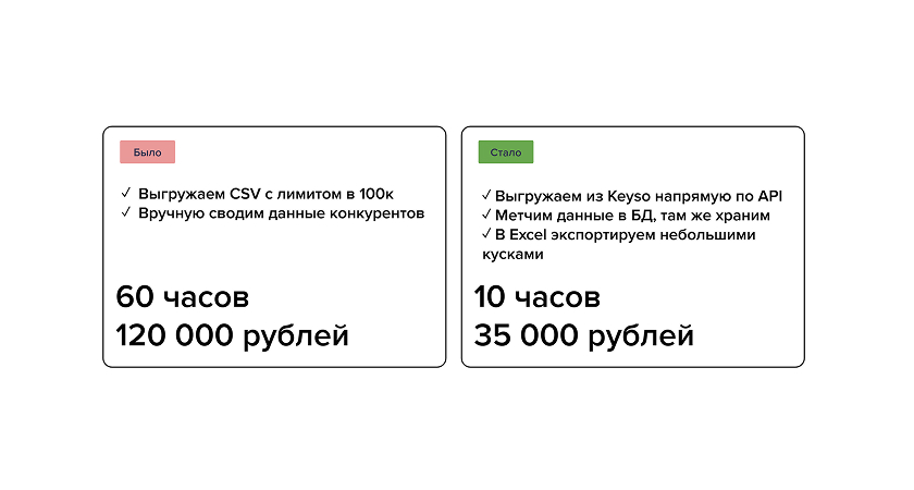 Так закрыли проблему объемов датасетов. Начали выгружать запросы из Key.so напрямую через API, а в Excel экспортировали компактными порциями.