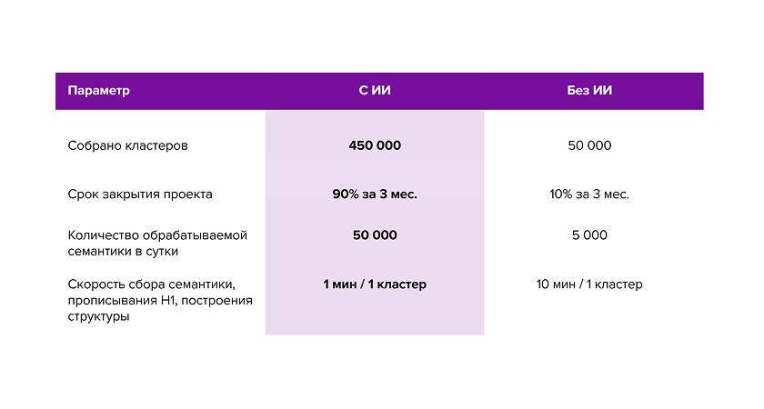 Клиент озвучил задачу: в течение полугода проработать семантику для 500 000 кластеров. Нужно было создать структуру, сформировать H1 и анкоры, провести типизацию страниц.