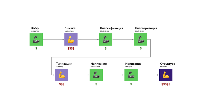 Качество в ущерб скорости. Традиционный подход с ручной работой над семантическим ядром. Максимальное качество, но минусы на поверхности: медленный темп и дорогая стоимость.